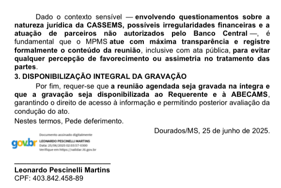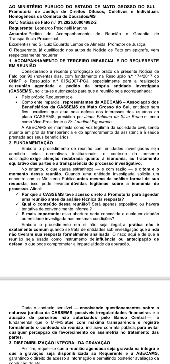 A decisão motivou um novo requerimento do denunciante, que formalizou pedido de presença na reunião e defendeu o acompanhamento de um terceiro observador imparcial, indicando a ABECAMS – Associação dos Beneficiários da CASSEMS do Mato Grosso do Sul, como representante da sociedade civil. Também foi requerida a gravação integral da reunião e disponibilização pública da íntegra do conteúdo.
