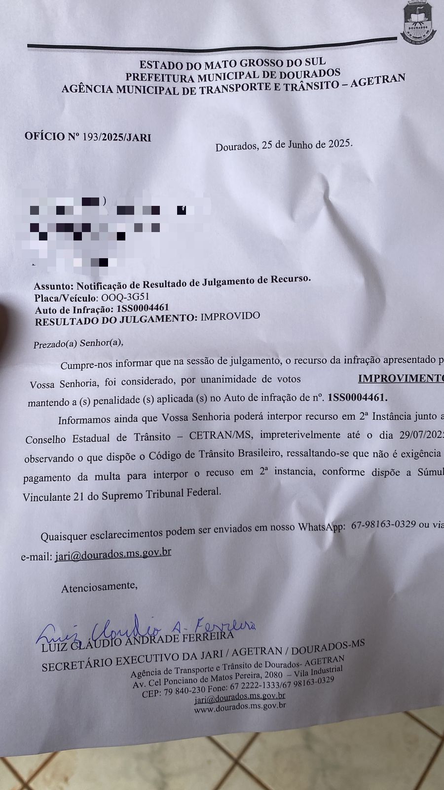 Em Dourados, as respostas aos recursos de multa parecem ter saído direto de uma fábrica de carimbos automáticos — e com defeito de digitação. A julgar pelos documentos analisados, o que deveria ser uma análise criteriosa de cada caso transformou-se em um modelo pronto, replicado sem a menor revisão. O mais emblemático: a substituição do termo “recurso” por “recuso” em um parágrafo padrão, repetido em despachos distintos, assinados pela mesma autoridade: Luiz Cláudio Andrade Ferreira, Secretaria Executivo da JARI/ AGETRAN.
