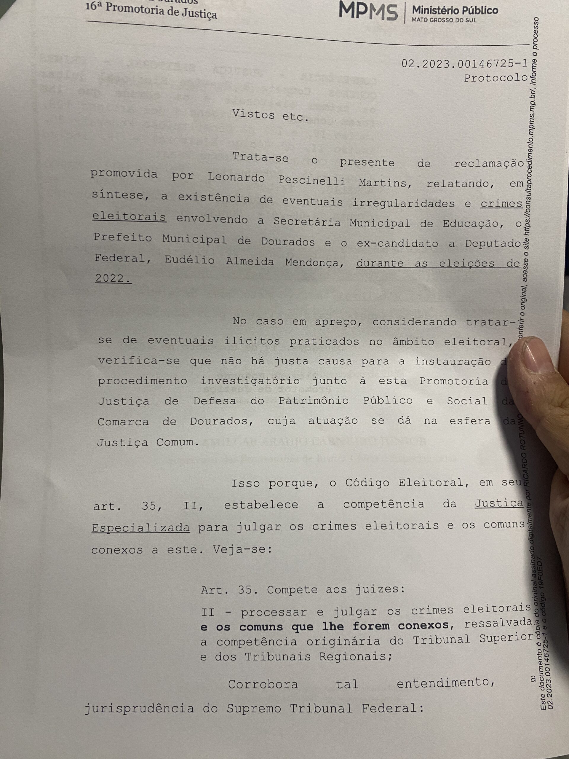 Os processos iniciais, registrados sob os números MP-MS-DOS-11-0-2023-15:10-018731-1/2 e MPHIS-DOS-11-0-2023-15:16-018730-1/2, foram posteriormente unificados sob o protocolo 02.2023.00146725-1. Em dezembro de 2023, o promotor Ricardo Rottuno declinou competência e encaminhou o caso à promotoria de justiça especializada em questões eleitorais. No dia 18 do mesmo mês, o promotor Amílcar Araújo Carneiro Junior confirmou a atuação da promotoria eleitoral da 18ª Zona Eleitoral, destacando a necessidade de apuração dos fatos.