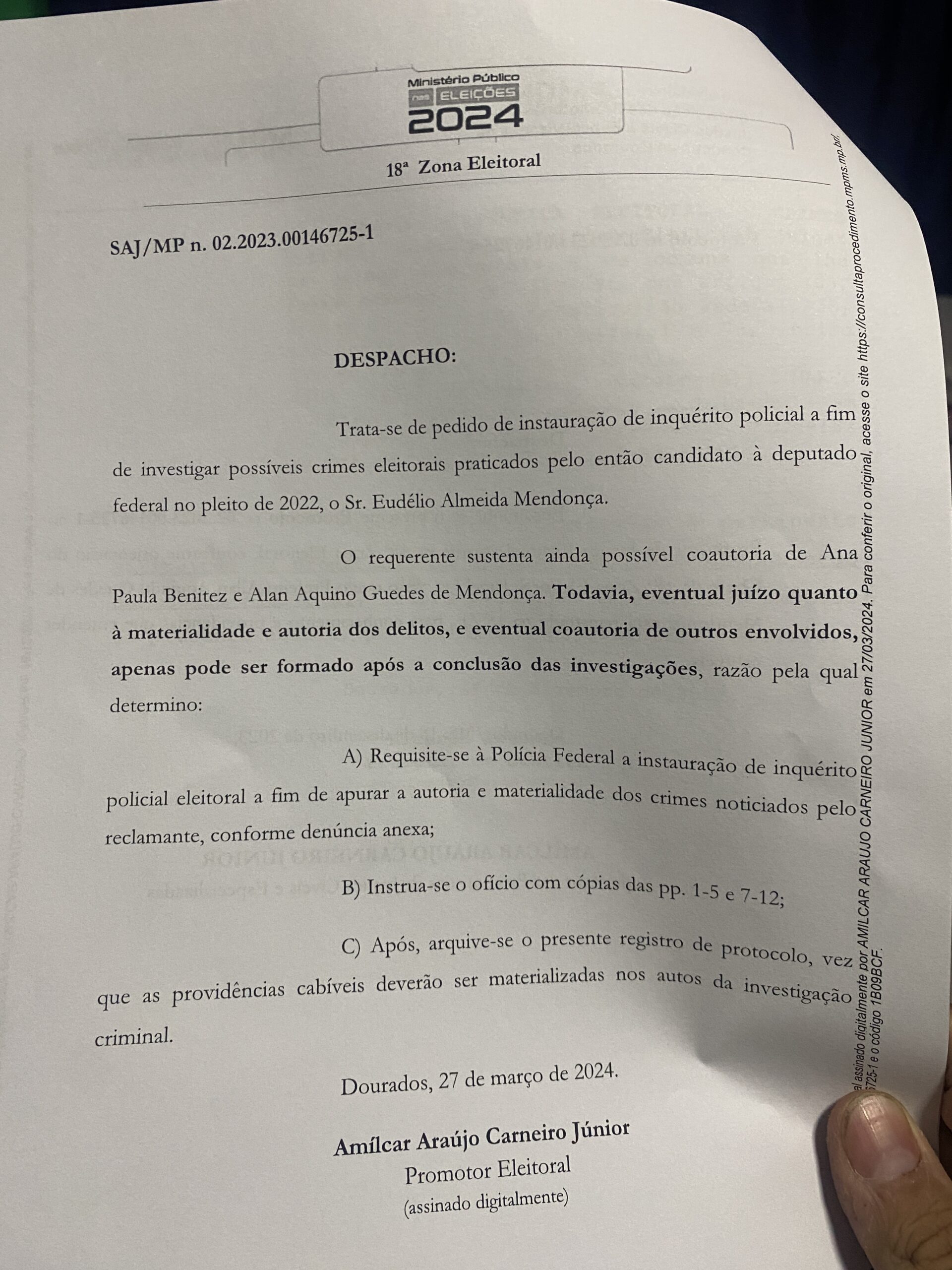 Uma denúncia protocolada no Ministério Público do Mato Grosso do Sul (MPMS) em novembro de 2023 resultou na abertura de um inquérito policial eleitoral pela Polícia Federal. O caso envolve a ex-secretária municipal de Educação de Dourados, Ana Paula Benítez, o ex-prefeito Alan Aquino Guedes de Mendonça e seu pai, Eudelio Almeida de Mendonça, que, à época, era candidato a deputado federal.