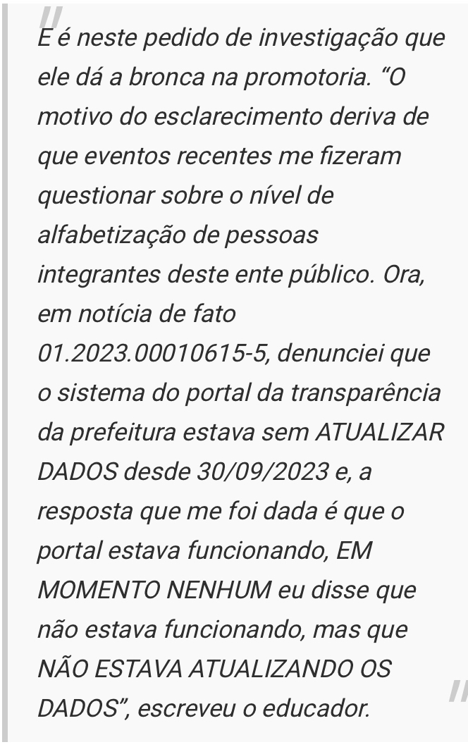 O professor Leo, que em 2022 foi candidato a deputado estadual pelo nanico AGIR, solicitou em dezembro de 2023 ao Ministério Público Estadual que apurasse o fato, segundo ele, de o site da transparência da prefeitura de Dourados não estar tendo atualização dos dados desde setembro de 2023.