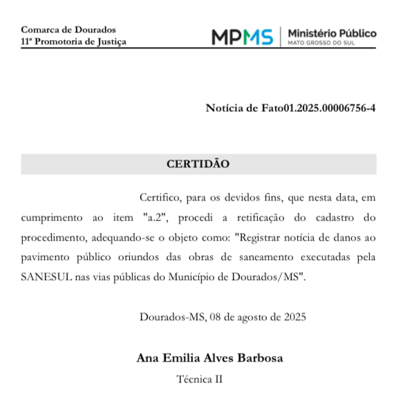 Manifestação noticiada por este jornal em 27 de Maio de 2025, sob o título editorial “SANESUL sob risco de perder concessão após sucessivos descasos em Dourados” evolui! Ministério Público abre investigação por danos ao pavimento urbano e a apuração já mobiliza Prefeitura e pode resultar em sanções à concessionária.