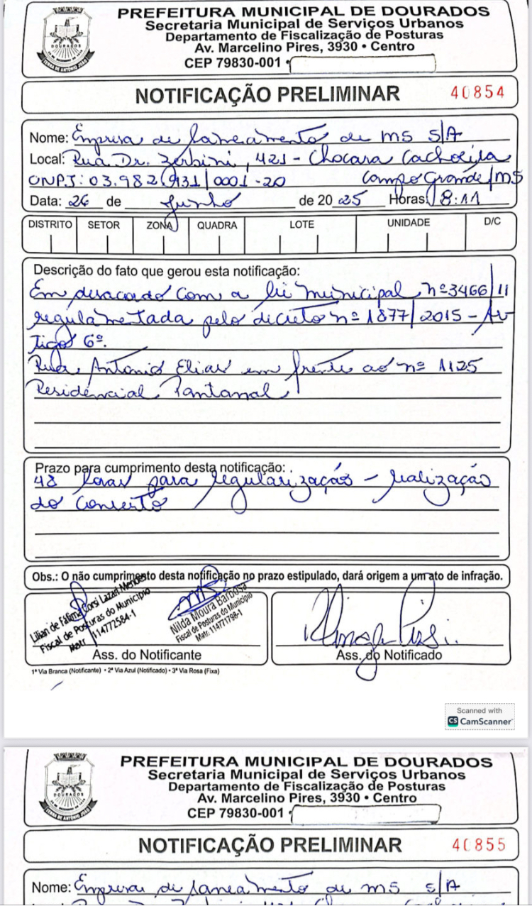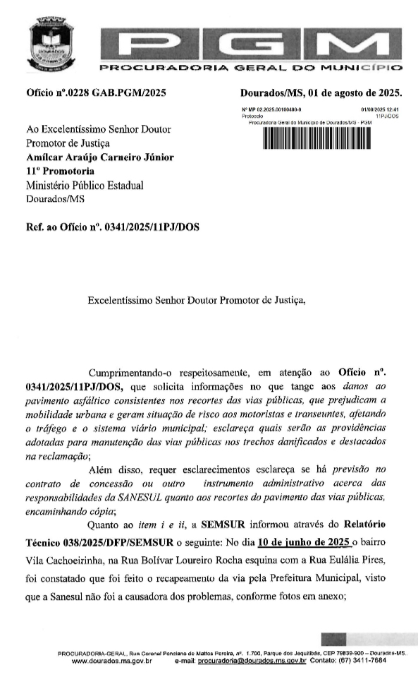 A manifestação do Professor, protocolada junto à 11ª Promotoria de Justiça da Comarca de Dourados, apontou que diversas vias públicas estavam sendo danificadas pelas intervenções da SANESUL, sem a devida recomposição do asfalto, como exige o contrato de concessão firmado com o Município.