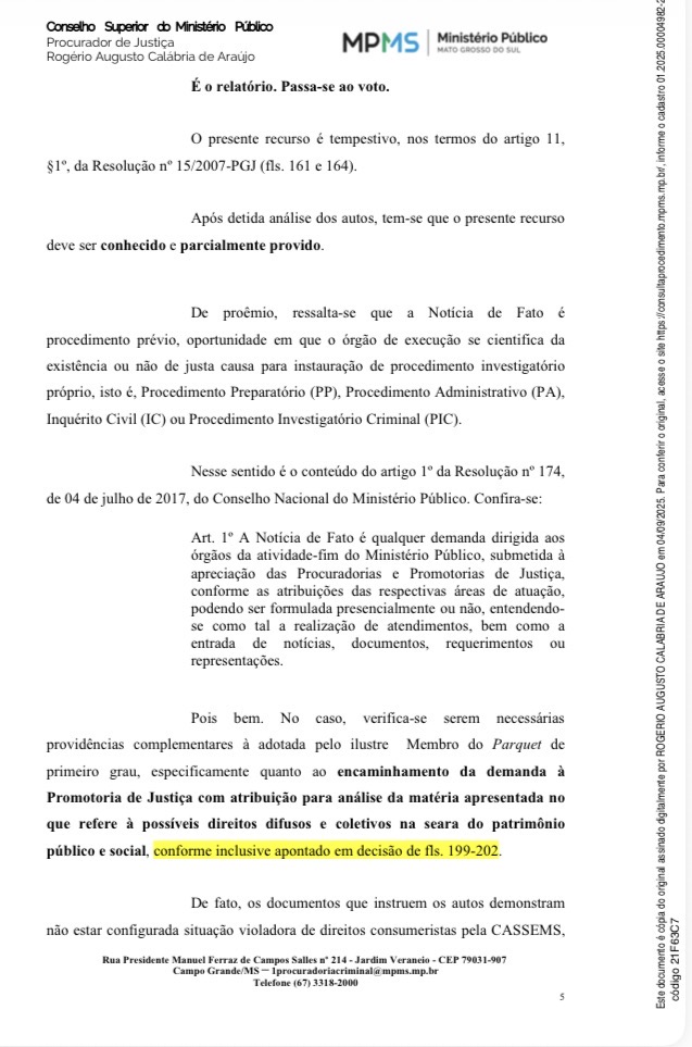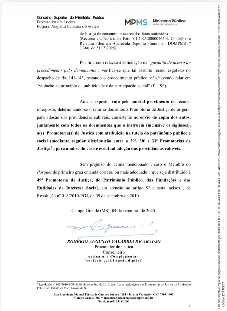 Após o arquivamento da Notícia de Fato nº 01.2025.00004982-2 pela 43ª Promotoria de Justiça, o denunciante Professor Leonardo Pescinelli Martins apresentou recurso ao Conselho Superior do Ministério Público. O voto do relator, Procurador de Justiça Rogério Augusto Calábria de Araújo, reconheceu que há indícios de desvio de finalidade e atuação comercial indevida por parte da CASSEMS, determinando o envio dos autos — inclusive os documentos sigilosos — para uma nova promotoria com atribuição na tutela do patrimônio público e social. A manifestação que originou o recurso está registrada sob o número 01.2025.00004982 e pode ser consultada publicamente.