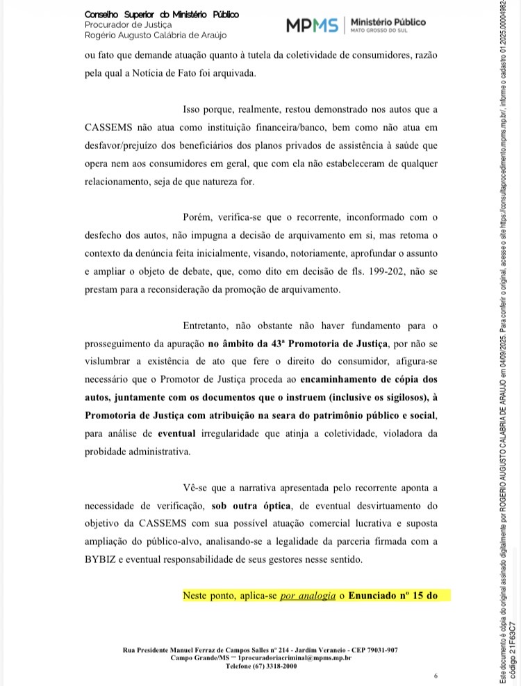 A Notícia de Fato nº 01.2025.00004982-2 havia sido arquivada pela 43ª Promotoria de Justiça, sob o argumento de que não havia irregularidade na seara consumerista. No entanto, o Conselho Superior reconheceu que os fatos apresentados pelo Professor — como o uso da marca “Banco CASSEMS” por terceiros, a parceria com empresa não autorizada pelo Banco Central (BYBIZ), e a previsão de divisão de lucros — extrapolam a esfera do direito do consumidor e podem configurar violação à probidade administrativa e desvio de finalidade institucional.